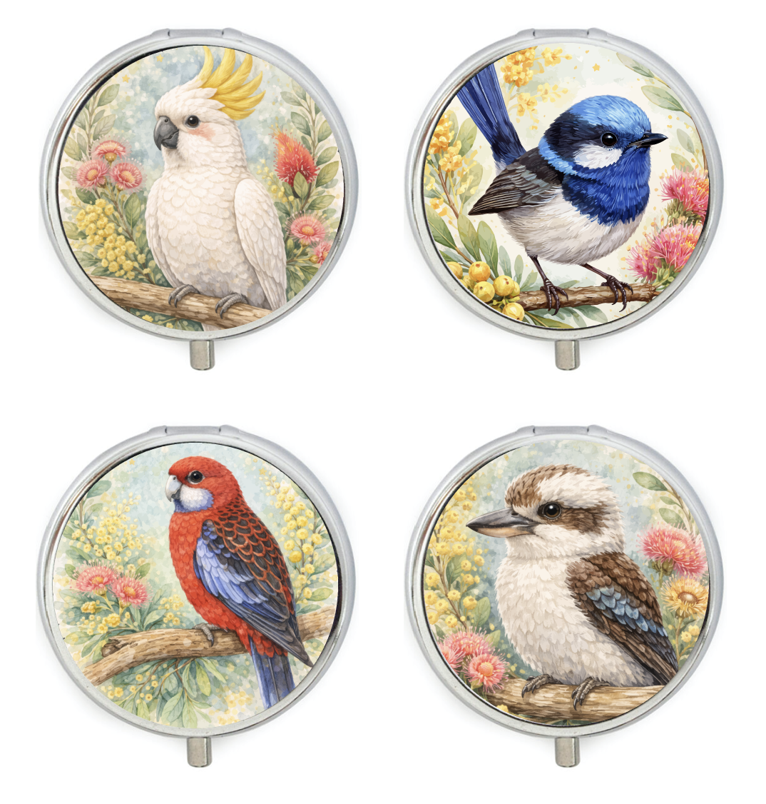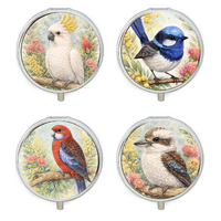 Pack of 12 Pocket Size Pill Boxes silver pill box decorated with 4 various Australian Native bird designs easy to open with a push button clasp - the inside comprises of 3 compartments and a small vanity mirror. Size: 4.5 Diametre.